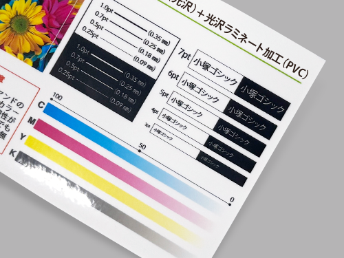 光沢ラミネート加工(PVC) - 白塩ビ(光沢)に光沢ラミネート加工(PVC)を施します。より光沢感のある仕上がりになり、印刷面の耐久性も上がります。